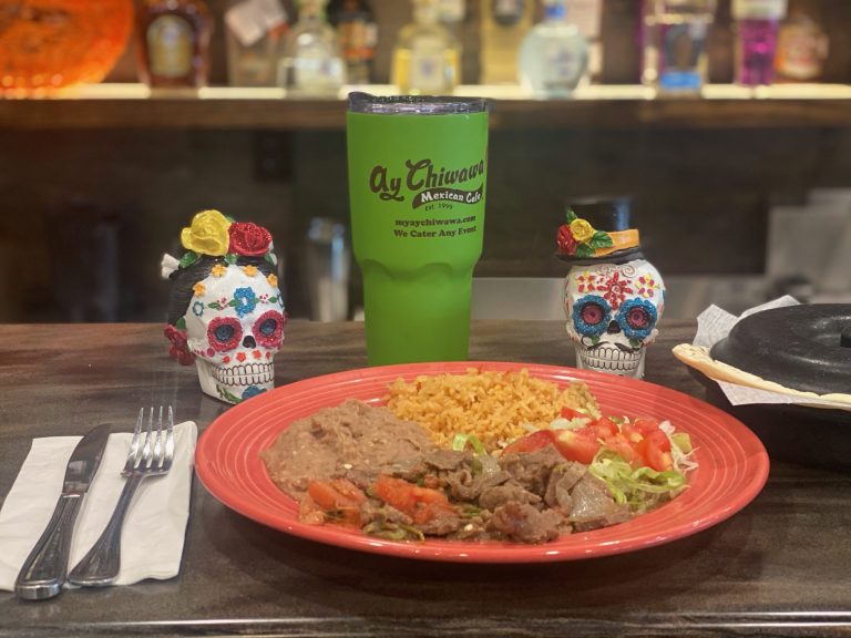 Indulge in an 8-10 oz. juicy steak topped with grilled onions, one queso fresco enchilada covered with guajillo sauce, Spanish rice, refried beans and guacamole